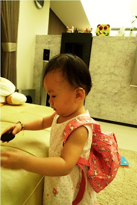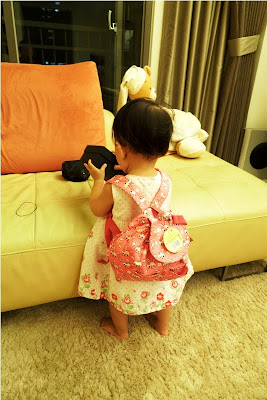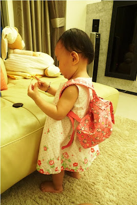 所以Grace趁著現在百貨公司周年慶,幫Anita買了一個小包包,以後自己背尿布。這款包包其實是在中友百貨後面的巷子裡,有一家專門賣小孩子的衣服及配件的賣店,貨色有很多,價格也不會很貴,Anita背在後面很好看,也很可愛。另外背包也有附一條繩子,避免亂跑的時候可以拉住,以後旅遊真的可以讓她背自己的東西。