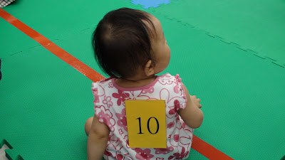 哨音終於響起,看到其他跑道的小朋友一股腦的往前衝,那~~我的Anita呢?居然一動也不動坐在起點,真有大將之風。我努力在終點搖晃著她最喜歡iPhone,始終不理我,這時候Grace完全看不下去,搶過我的iPhone,跑到中間位置去吸引她前進,好不容易前進到中間位置,她又被其他小朋友拿有聲音的玩具所吸引,怎麼喊都不理我們,一分半鐘的時間就這樣過去,哨音響起,時間到了,這時候Anita才突然想到,努力爬到終點。