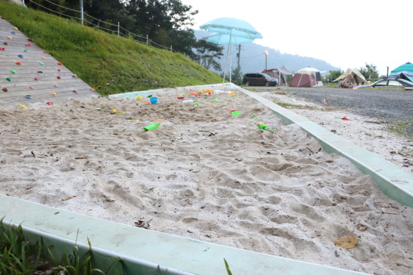 ▲ 沙坑有提供陽傘遮陽,但數量不夠多