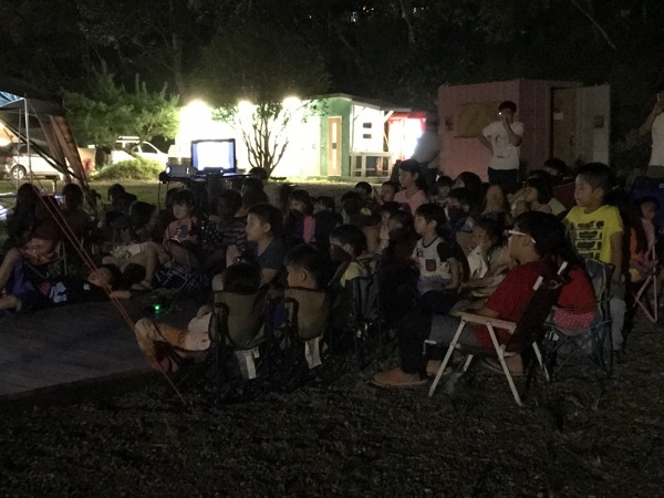 ▲ 一到時間,小孩都聚集在投影幕前,聚精會神看著電影