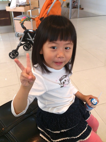 Anita從小剪頭髮都需要人家抱著剪,不然很難動到她的頭髮。一開始還是吵著要我抱她,好多歹說她還是不願意一個人坐在那裡乖乖的讓阿姨動刀,我只好使出絕招,用一瓶【養樂多】跟她交換,沒想到這招奏效,居然願意乖乖的坐著讓阿姨在她頭頂上動刀,太神奇了!趕緊拿手機記錄下來這歷史性的一刻。