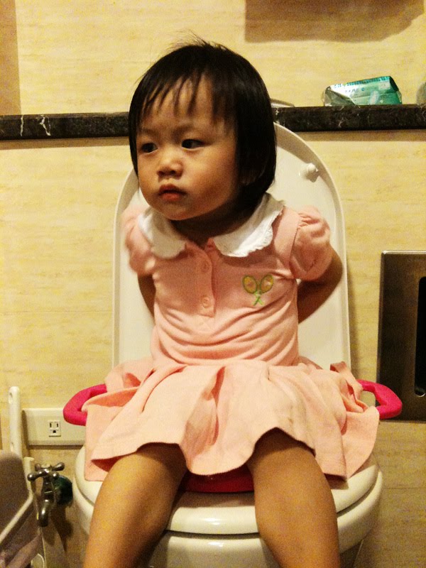 晚餐吃完後通常Anita會想要便便,現在正式訓練她的時機,於是用完晚餐後都會帶她去找馬桶寶寶,告訴她馬桶寶寶會吃便便,以後要便便要告訴爸比或媽咪,要找馬桶寶寶喔。這是每次最基本的對話,只是她剛開始接觸馬桶寶寶比較不安,醞釀時間也比較長,我都會坐在他對面看著她上廁所,避免看不到我們想爬起來。