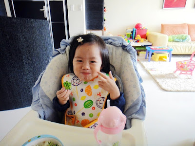 這二次Anita吃飯又出現新招,就是她對爸比或媽咪碗中的飯菜特別有興趣,明明和她吃的都是一樣的呀!只是Anita的菜菜,我會用食物剪幫她剪碎些,但她就是覺得別人的比較好吃!